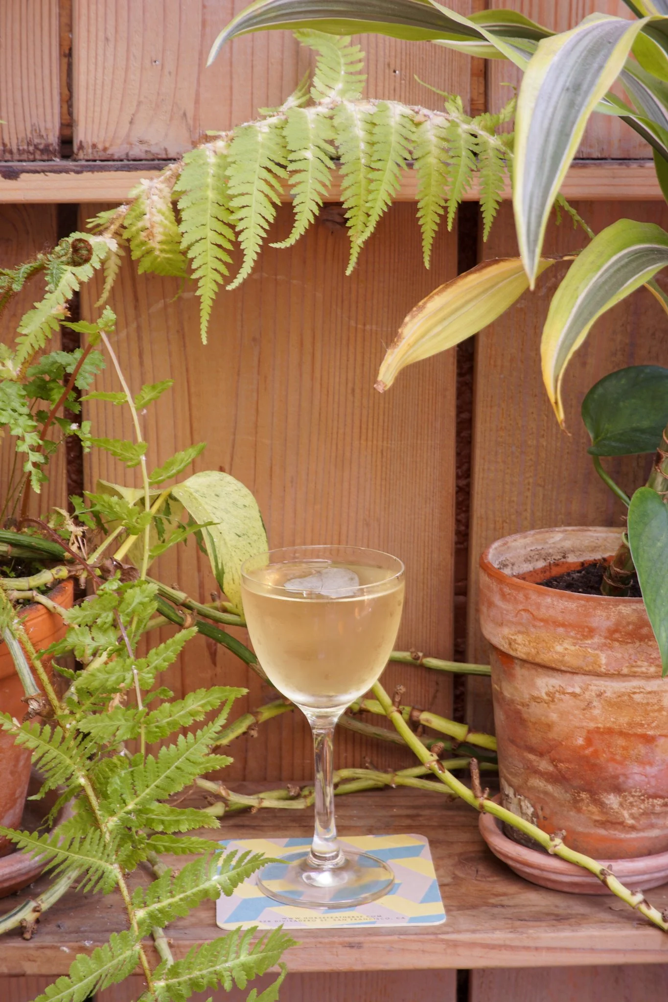 islay gin, kina aperitif, manzanilla sherry, apple, chrysanthemum